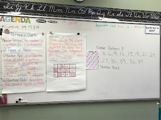 Math:Today we started the first lesson of our new unit, "Exploring Number Patterns." Today we looked specifically at exploring patterns in a hundreds chart. As you can see, the expectations for communicating number patterns, number rules & position rules are in the chart paper images below. We completed the examples together, having students come up to show the pattern in the hundreds chart, along with write out our rules for those patterns. The terms we use for our position rule & number rule depend on whether a number pattern is increasing or decreasing.
