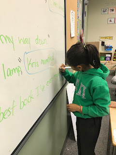 Inquiry into Language: Today we learned about quotation marks! We began by understanding the use of quotation marks. They are to tell you what someone is saying in a dialogue. We also learned that a dialogue tag is the person who is talking. We practiced circling the dialogue tag and adding the quotation marks and commas into sentences. We did many examples as a class and then moved on to independent work.
