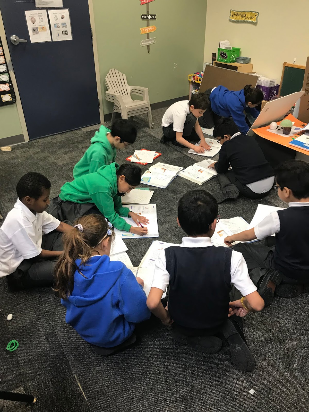 Inquiry into Math: Today we learned about rotations! This was a tricky concept so we practiced together on the carpet. We learned that a shape can change direction; clockwise or counter clockwise. It can turn once (1/4 turn), twice (1/2 turn) or three times (3/4 turn). Just like a clock! We used our bodies to practice going clockwise and counterclockwise. We realized that depending on the number of turns and which direction you are going you can end in the same spot! We did a practice exit ticket before doing textbook questions.